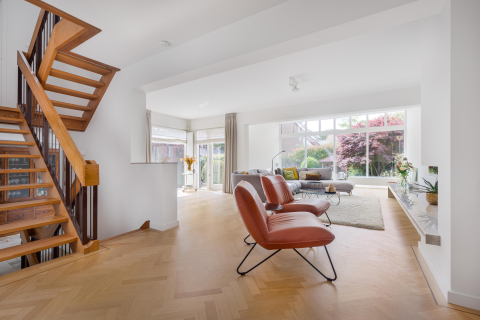 Begane grond: entree, hal, toilet, royale woonkamer met vloerverwarming en openslaande deuren naar de tuin, open keuken met diverse inbouwapparatuur, doorloop naar de dubbele garage;